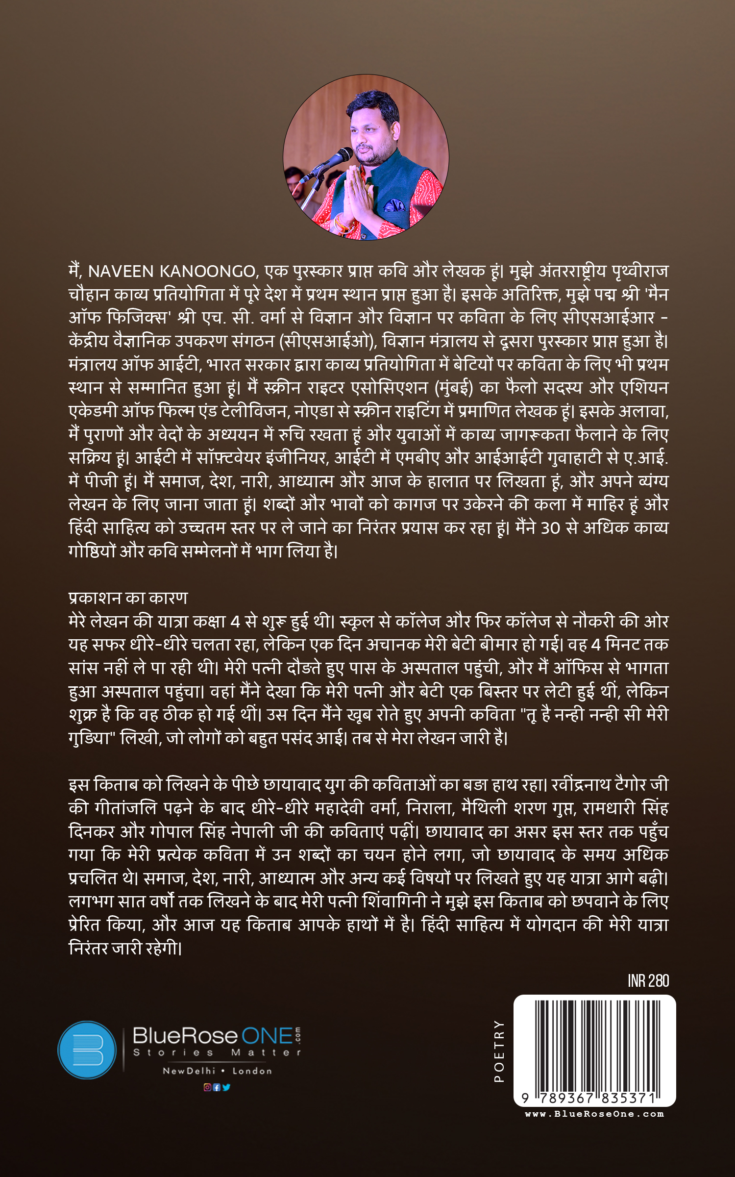 Naveen Kanoongo is an award-winning poet and author, known for his deep and thought-provoking poetry. He has been recognized in several prestigious poetry competitions, including: